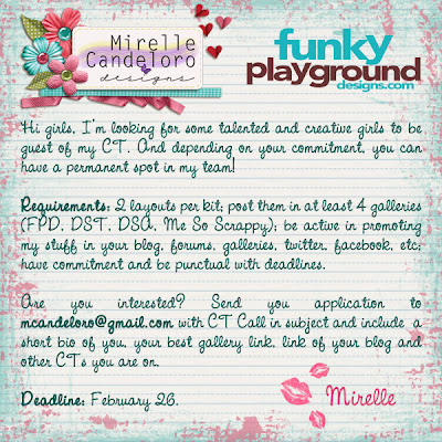 Requerimentos: 2 layouts por Kit; postá-los em no mínimo 4 galerias (FPD, DST, DSA e Me So Scrappy); ser ativa e promover todos os produtos, anúncios, etc, em seu blog, fóruns, galerias, twitter, facebook, etc; ser comprometida e principalmente pontual nos prazos estabelecidos.